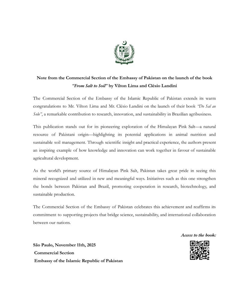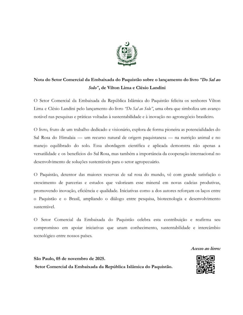 O lançamento do livro Do Sal ao Solo, escrito por Vilton Lima e Clesio Landini, recebeu uma manifestação oficial da Embaixada da República Islâmica do Paquistão, reforçando o impacto internacional do projeto e sua relevância para o agronegócio e para a sustentabilidade.